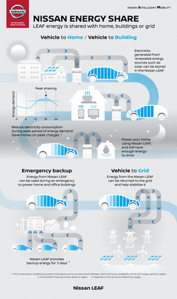 - Vehicle-to-home (V2H): Nissan is working with partners to bring inexpensive equipment to the market to popularize V2H. Using V2H, owners of Nissan electric vehicles can use their cars as a power source for the household to save money on electricity bills, or as backup power during blackouts or emergencies. This allows the usage of renewable energy when available, or when electricity is cheaper.
